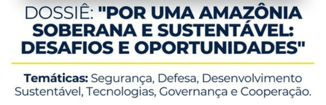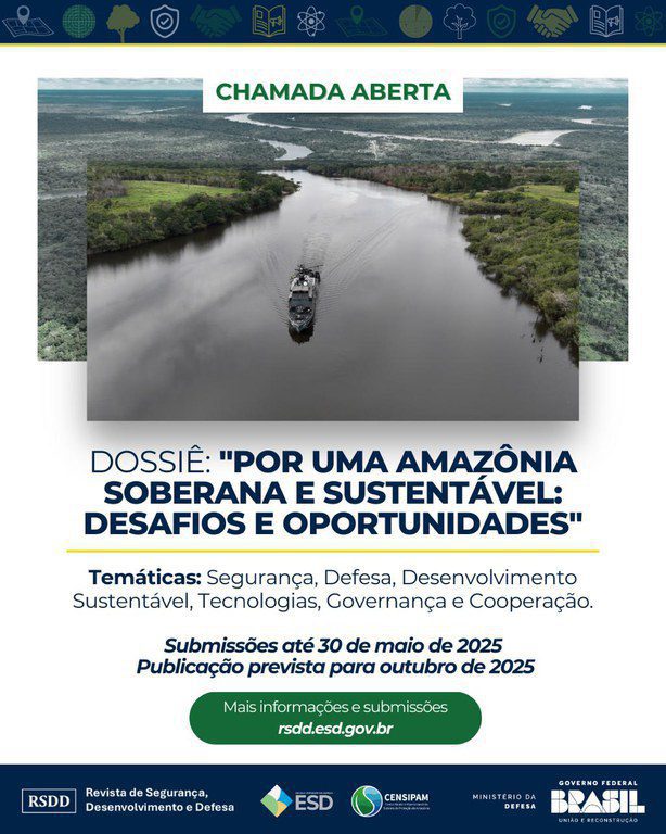 Brasília (DF), 31/3/2025 – O , por meio da Escola Superior de Defesa (ESD) e do Centro Gestor e Operacional do Sistema de Proteção da Amazônia (Censipam), está selecionando pesquisas para o dossiê “Por uma Amazônia soberana e sustentável: desafios e oportunidades”. O tema leva em conta a realização da COP30 no Brasil, em novembro, e a Amazônia como foco nas dinâmicas climáticas globais. Os materiais escolhidos serão publicados na Revista de Segurança, Desenvolvimento e Defesa, da ESD, em outubro.