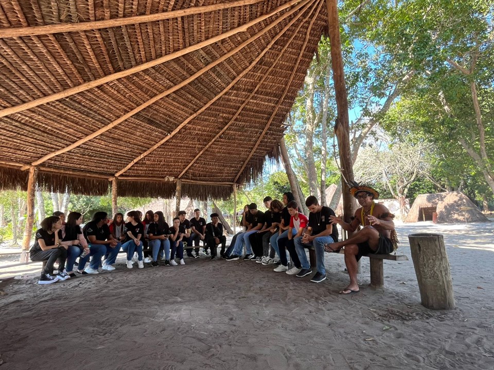 Durante a visita, os estudantes participaram de uma experiência transformadora com a visita à Aldeia Temática Tekoá Mirim, em Aracruz. A atividade proporcionou uma imersão na cultura do povo Guarani, com oficinas de artesanato, vivências sobre o uso sustentável dos recursos naturais e contato direto com tradições ancestrais. A iniciativa reforçou o respeito à diversidade cultural e ampliou o olhar dos estudantes sobre os povos originários do Espírito Santo, promovendo aprendizado além da sala de aula e fortalecendo valores como empatia, identidade e pertencimento.