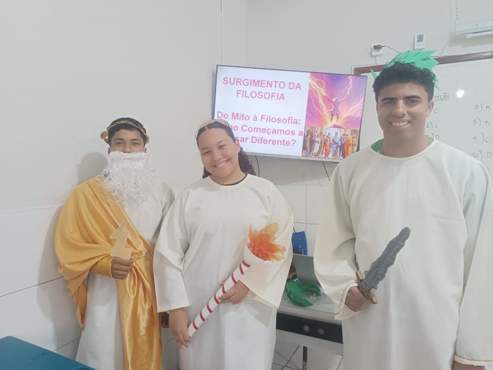 O objetivo foi proporcionar aos alunos uma compreensão concreta sobre o surgimento da filosofia na Grécia Antiga, destacando a transição do pensamento mítico para o racional. Por meio da dramatização de mitos gregos, os estudantes puderam vivenciar o contexto cultural anterior ao nascimento da filosofia, interpretando personagens como Zeus, Prometeu, Atena e outros seres mitológicos, que simbolizam valores e explicações que, à época, tentavam dar sentido ao mundo.