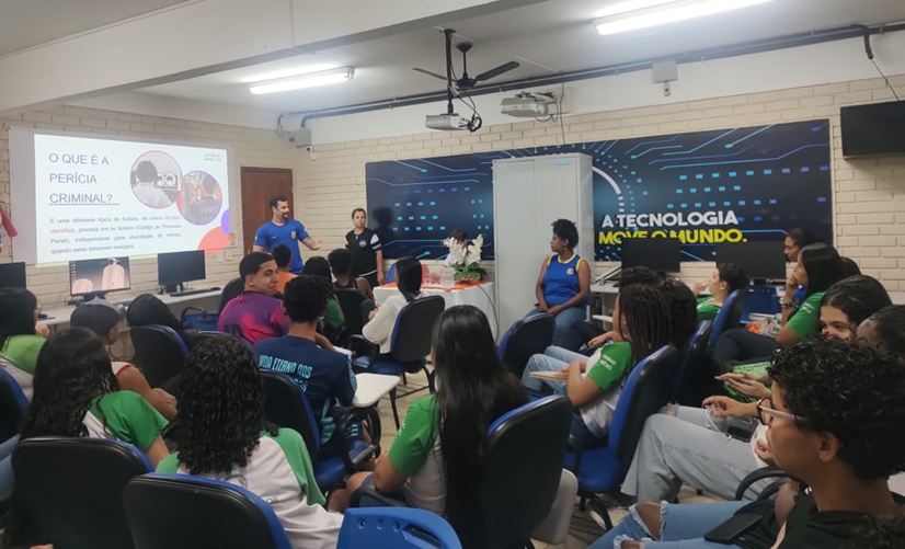 Com o intuito de promover o debate sobre o trabalho do perito criminal entre os estudantes dos cursos técnicos em Análises Clínicas e Administração, a Escola Estadual de Ensino Fundamental e Médio (EEEFM) Professor Pedro Simão, localizada no município de Alegre, promoveu, na última sexta-feira (04), o “Circuito Jovem Perito Itinerante”. A iniciativa teve como objetivo ajudar os alunos a explorar aspectos da carreira, alinhando seus interesses e habilidades com a possível profissão.